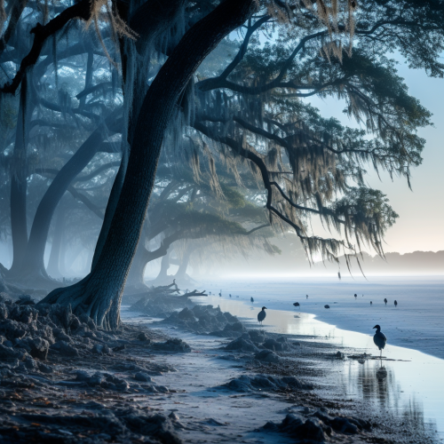 Similar 2 tone (black and light sky blue) image of gulf beach, oak trees with Spanish moss, seagulls, foggy, early morning