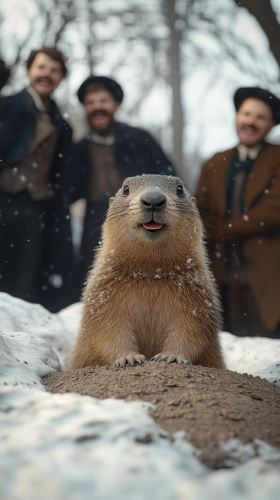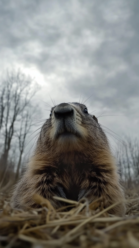 The overcast sky indicating that spring is near, the sky full of grey clouds, 1887, natural surroundings, with Phil, the groundhog, standing outside looking relaxed, trees and ground slightly thawing, wide shot, hyper-realistic, photo realism, cinematography --ar 9:16