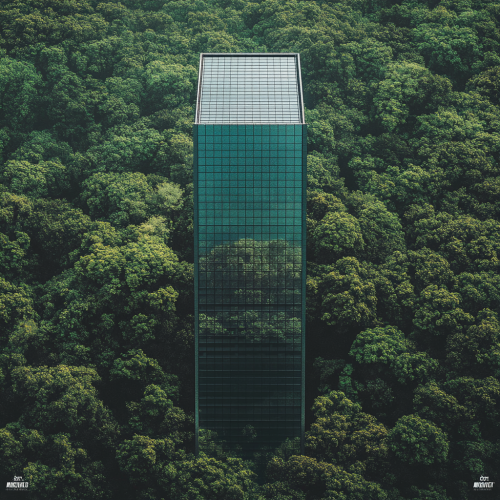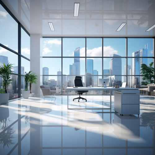 Create a realistic scene of a worker cleaning the glass facade of a modern office skyscraper using alpine techniques. The worker is suspended by ropes and harnesses, wearing safety gear, including a helmet and gloves, with tools like a squeegee and water spray bottle attached to his belt. The building has sleek, reflective glass panels and towering architecture, set against a bright sky that reflects on the glass. The perspective emphasizes the height and scale of the building, with the worker positioned halfway up, highlighting the meticulous and skilled work of facade maintenance