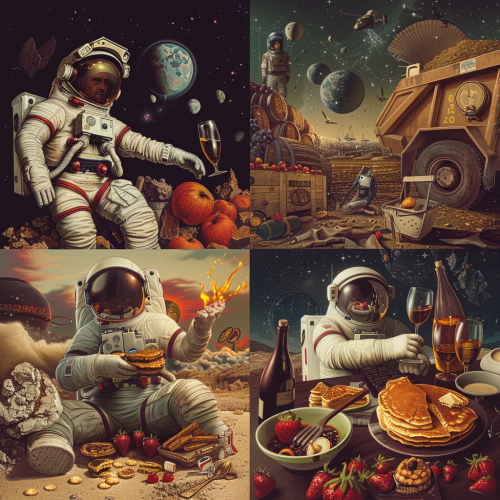 #104057 One picture shows four people. The first one is an astronaut. The second is the driver of a dump truck. The third e t is a wine producer. The fourth is the cook who bakes pancakes. --v 6.0 --ar 1:1