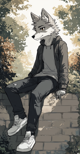 A drawing of a wolf furry creature wearing dark grey jeans and a long sleeve t-shirt while sitting on a brick wall. The style of his short hair is cartoon-like, he has two small brown eyes, a sketch, line art, the background has trees and bushes, the feeling is calm and subtle, The aesthetic is anime-inspired. --ar 38:73 --v 6.1