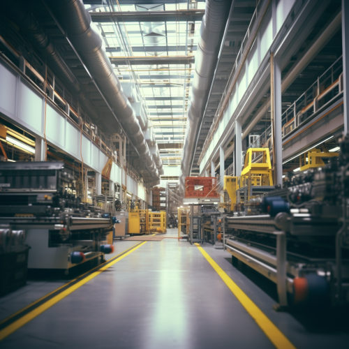 A geometric illustration of a warehouse cutout dollhouse, single story, filled with vertical farming equipment growing fruits and vegetables with an industrial machine assembly line