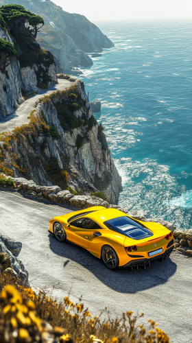 A vibrant yellow Ferrari F8 Tributo positioned at a scenic coastal overlook, with dramatic cliffs and the ocean in the background. The car’s aerodynamic shape and bright color pop against the natural beauty of the landscape. The sunlight catches the car’s polished surfaces, enhancing the feeling of speed and luxury in this breathtaking environment. Ultra-detailed, photorealistic with ocean view, 8K resolution --ar 9:16 --v 6.1 --style raw