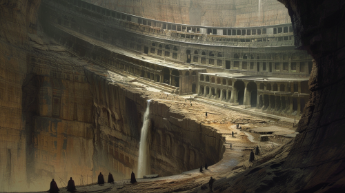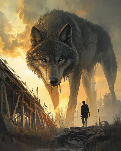 Ethan is a 20 years old man with dark hairs and grey eyes - he has very big wolf friend, taller than a man - they are walking next to a broken bridge, in a post apocalyptic world - jean baptiste monge style. Smoky sunrise light --ar 4:5