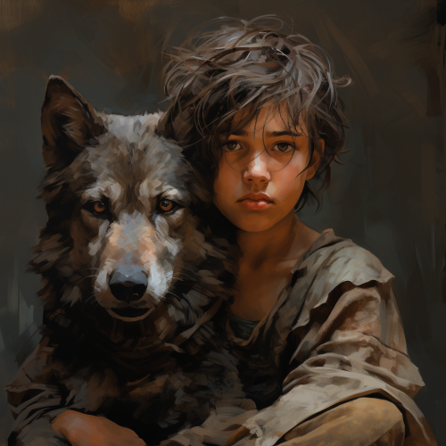Ethan is a 20 years old man with dark hairs and grey eyes - he has very big wolf friend, taller than a man - they are walking next to a broken bridge, in a post apocalyptic world - jean baptiste monge style - running in the dark magic forest with his wild animal pet. A man running in the forest with his legendary grey wolf, post apocalyptic --ar 2:3