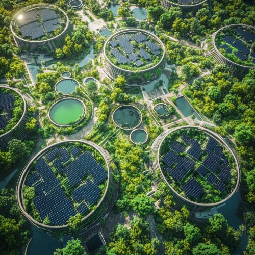 A detailed masterplan rendering of a sustainable, futuristic site designed for carbon neutrality. The site includes multiple large algae ponds, public ramps that allow people to move through and observe different areas, a pod algae system, and vertical algae farms for high-density cultivation. Green spaces with trees, shrubs, and native plants are interspersed throughout. Several carbon capture towers are positioned strategically, connected by a visible flow of energy. Show distinct pathways for people, water channels for algae cultivation, and renewable energy installations (like solar panels and wind turbines) that emphasize a closed-loop energy flow. The overall layout should feel interconnected and vibrant, highlighting the sustainable ecosystem and the harmony between natural elements and technological infrastructure.
