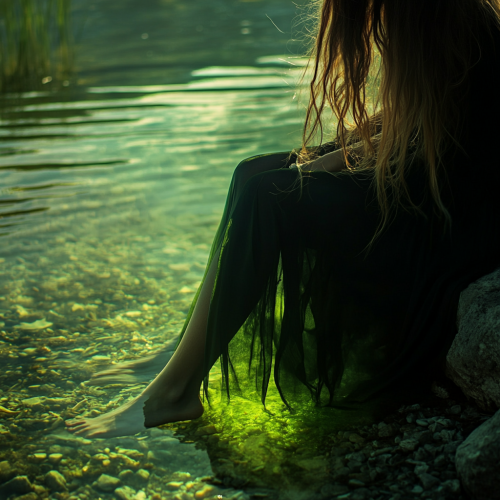 algae growing in the clear water rise up the legs of a beautiful woman, gently enveloping the woman's legs lowered into the lake. wide algae glowing from the inside, sinuously one by one, wrapped around the silhouette of a long-haired woman and her legs sitting on the shore, against the backdrop of stones and tall grass, a sunny day in the style of oil paints