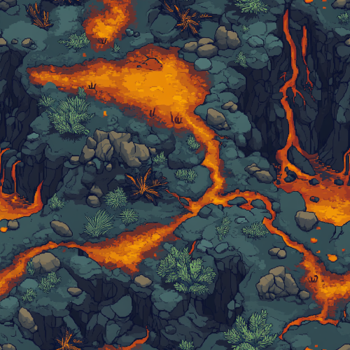 a 2D topdown tilebased game map, low poly art, high contrast colors, pixel art, 2d game sprite, 48x48, 16 bits , is of an purgatory scene with some weird vegetation and lava ponds --tile