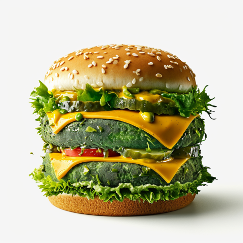 A McDonald's Big Mac which all the ingredients are made entirely of different colored algae overbloom, surreal, realistic, food photography, natural light, white background, dead fish --ar 1:1 --v 6.0