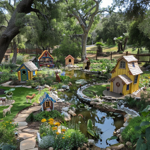 Claremont Country club transformed into a verdant tiny house village with ponds, fruit trees, Oak trees, modern play area, library, birds, deer, multi ethnic people