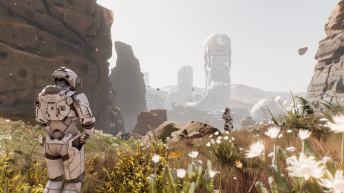 Futuristic scene in a southern landmass on June 26, 2054, showcasing environmental and technological changes. The foreground shows researchers in advanced eco-suits studying resilient plant species in a rewilding project. In the background, towering cliffs and biodome structures are visible under a clear sky, reflecting ongoing conservation and climate adaptation efforts. The lighting is bright and clean, capturing the intersection of nature and technology in a future world reshaping itself. --ar 16:9 --v 6.0 --style raw
