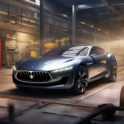 maserati design sketch of a new car 2030 with a electric engine in a factory with supplier