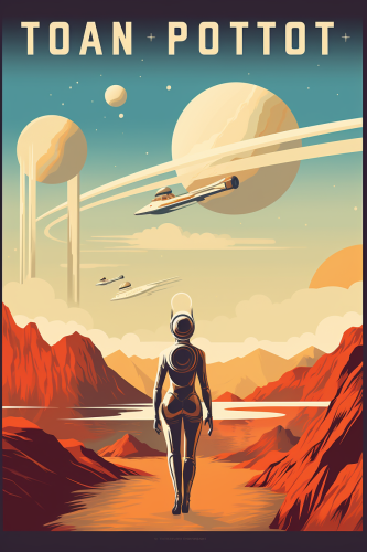 futuristic elegant woman astronaut travel poster to imaginary planet old destinations --ar 2:3 --v 5.2