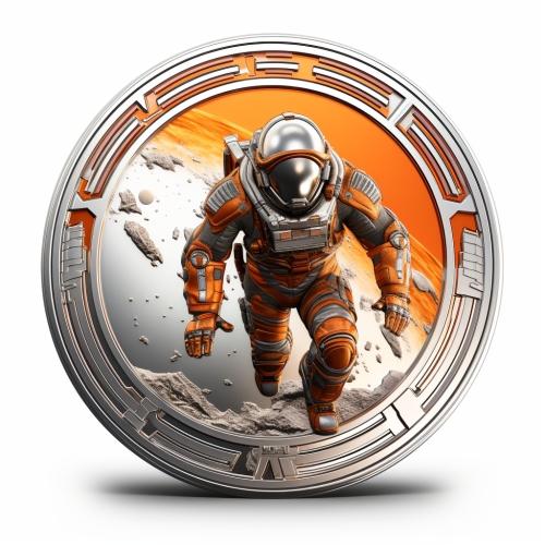 Engraved futuristic astronaut landing on Planet Genesys