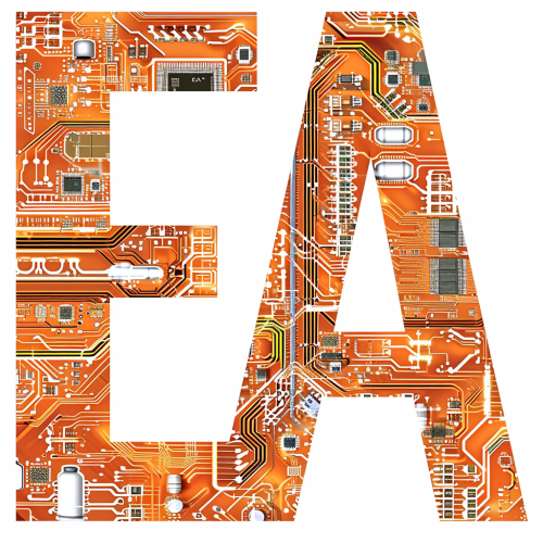 The letters "EA" filled with circuit and computer chip photorealistic elements. It should leverage various shades of orange and white. It should have a white background --v 6.0