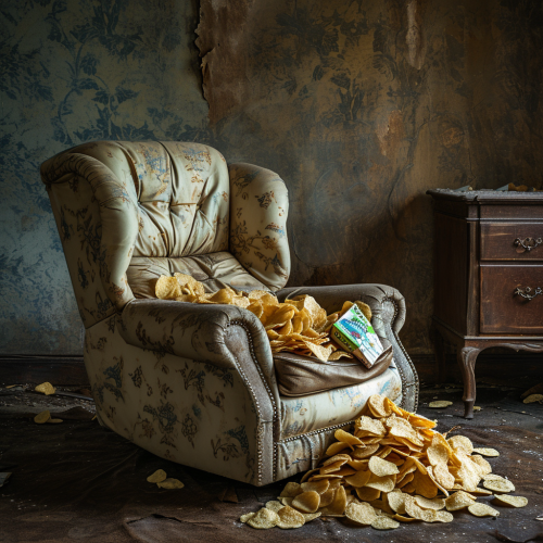 a la-z-boy recliner with a bunch of potato chip bags --v 6.0