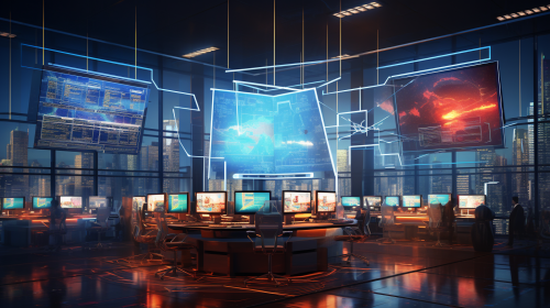 High-tech trading floor, screens displaying "HolyG" and crypto charts, futuristic design, detailed, cinematic lighting Score: 4.0 --ar 16:9