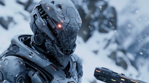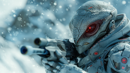 humanoid reptile with laser gun on snow , very futuristic, epic, cinema,8k --v 6.0 --s 250 --ar 16:9