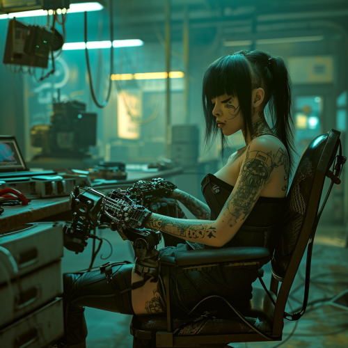 a photo of a beautiful japanese girl sitting in a chair working on a broken android. the android is hanging limply from wires in a dystopian, cyberpunk mech lab. dark, dystopian, cyberpunk, tattoos, film grain --style raw --v 6.0