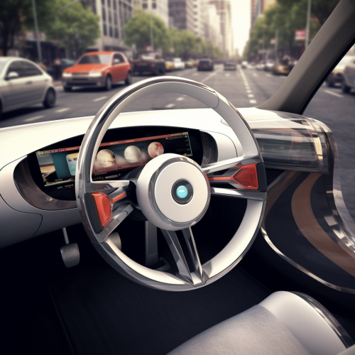 close up of steering wheel in car on cyberpunk highway, glowing teal lights, high quality photography, 8k, --ar 1:1 --s 750 --v 5.1