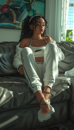 Cindirella play PlayStation 5 in couch, full body, nike outfit, feet, --ar 4:7 --v 6.0