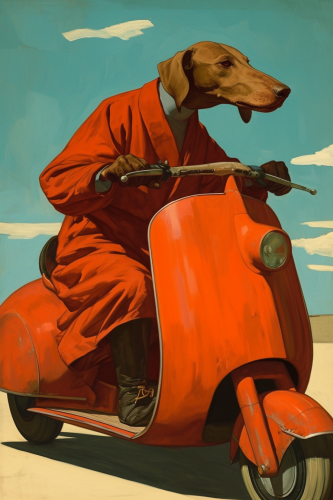 a dog driving an e-scooter, designed by Tamara de Lempicka --ar 2:3 --niji 6
