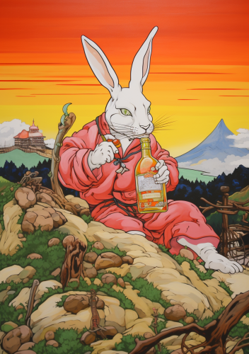 coloured manga style, wide shot, an anthropomorphic rabbit as a asian drunken master with a bottle in his hand, in a chinese landscape with a distant village in the background, dynamic pose --ar 7:10 --upbeta --s 50
