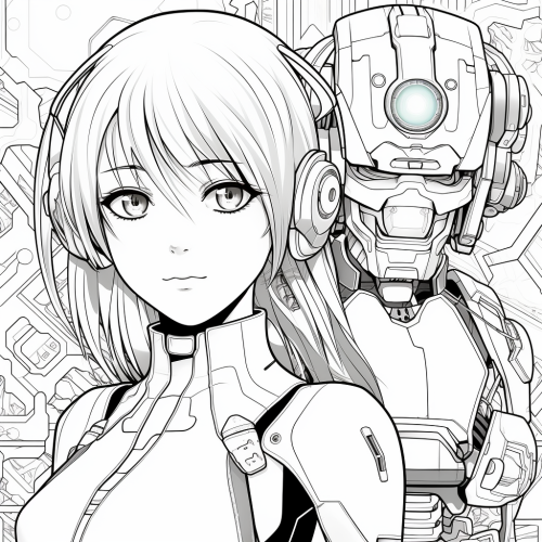 Black and white coloring page of an anime-style futuristic robot companion standing beside a spirited young heroine with colorful bold hair, both outlined with bold realistic lines, showcasing the contrast between human and machine, reminiscent of the technological themes explored in some of Hayao Miyazaki's films.