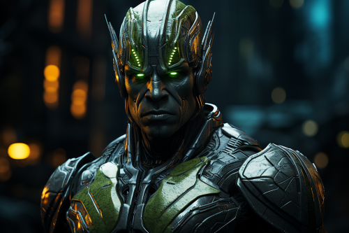 Futuristic city jedi, middle light, hulk robot outlined with a green neon line --s 750 --ar 3:2