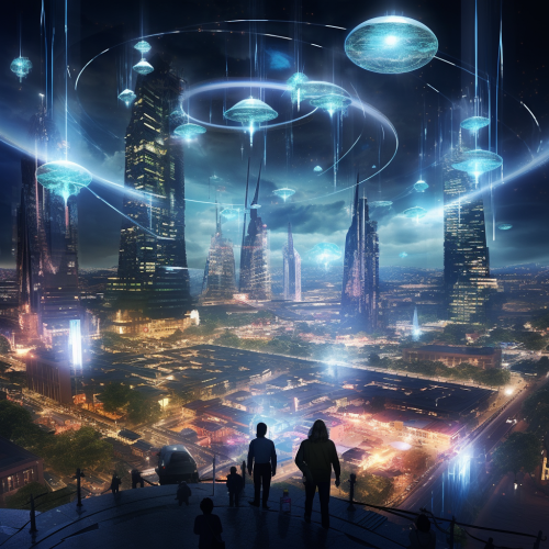 A dystopian scene of a cityscape that stretches to the horizon, with towering buildings reaching all the way into space. It's midnight, and the city is in total blackout, creating a dark, eerie atmosphere. A lone angel with white wings gracefully flies above the city, illuminated softly against the deep night sky. The contrast between the dark, power-less metropolis and the glowing angel adds a surreal and otherworldly touch to the scene. --ar 20:9 --p xwfri5q --niji 6