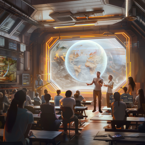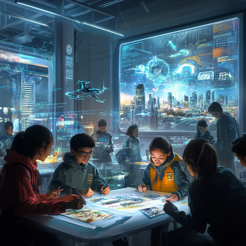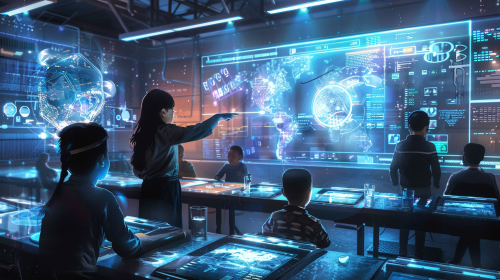 A futuristic classroom with holographic displays and a teacher guiding students through immersive historical events, students looking engaged and inspired, high-tech devices on desks, sleek metallic walls with educational graphics. Soft, warm lighting highlights the enthusiasm of the students. Created Using: digital art techniques, cyberpunk elements, advanced holographic design, cinematic lighting, high-definition details, dynamic composition, educational technology theme, hd quality, natural look --ar 16:9 --v 6.0