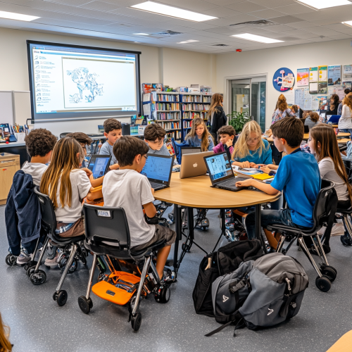 A classroom scene showing students of various abilities collaborating on a project, with tools like laptops and adaptive devices in use, a warm and supportive atmosphere that highlights the importance of inclusivity and equal opportunities in education