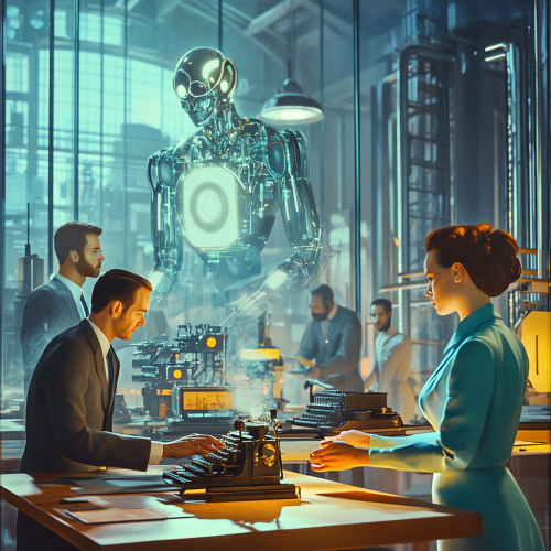 Visualize a futuristic workplace scene illustrating how 60% of today’s job titles didn’t exist 80 years ago. Show a diverse group of professionals engaged in modern roles, like data analysts, AI specialists, and renewable energy engineers, contrasted with a background hinting at older jobs, like typewriters or factory machinery. The setting should blend vintage and futuristic elements, symbolizing the evolution of work over decades, with vibrant lighting and modern tech devices subtly highlighted.
