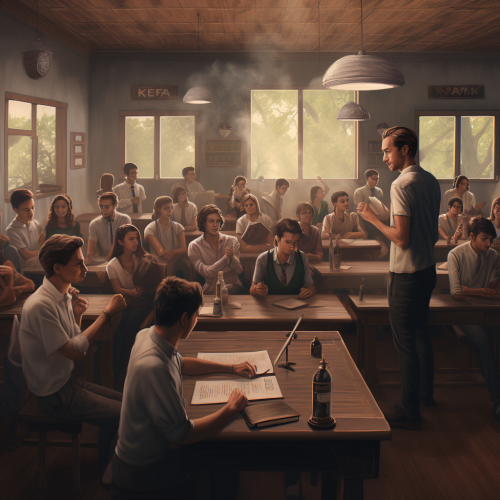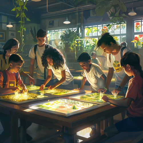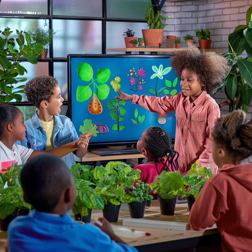 A vibrant classroom scene with students engaging in a multisensory lesson on photosynthesis, colorful diagrams on a smart board, a teacher explaining verbally while students interact with plants in a hands-on activity, inclusive and dynamic environment, HD quality, vivid and diverse colors, natural look --ar 1:1 --v 6.0
