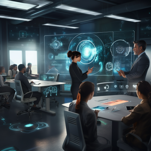 an engaging futuristic adult learning classroom with a trainer using AI to teach interactively, photorealistic, 4k