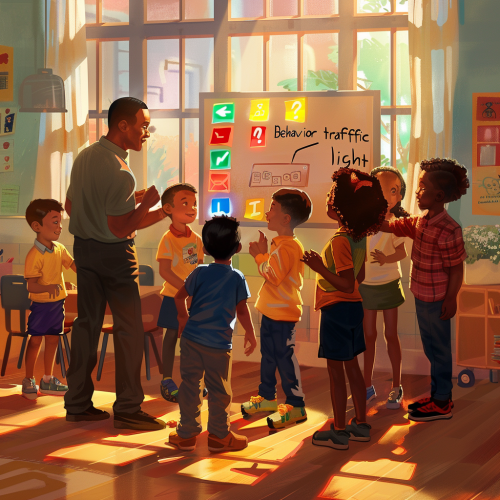 A teacher engaging with students around a "behavior traffic light" chart, fostering a collaborative environment, diverse group of students, warm and welcoming classroom setting, vibrant hues, sunlight filtering through windows, HD quality, vivid color style, natural look --ar 1:1 --v 6.0