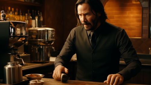 Barista having a lovely conversion with client in a minimalist coffee shop --ar 9:16