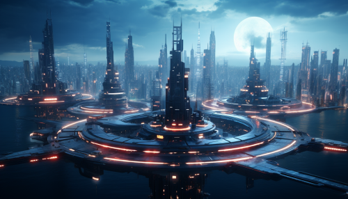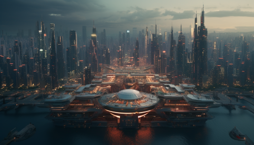 epic aerial shot of futuristic cyberpunk New York City, aspect 7:4