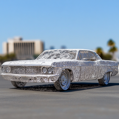 A unique never been seen before, futuristic cool east los angeles low rider car made out of lace, with oversized sharp edged folded angled forms. The front three quarter view shows the entire car, minimalistic background