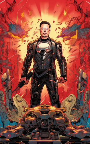 Elon Musk, victorious, standing over the defeated Oil Baron, Comic book panels in the style of Jack Kirby --ar 10:16