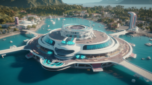 "Design a coastal city in the year 2050, blending modern architecture from 2024 with subtle futuristic elements. Skyscrapers made of glass and sustainable materials tower over the city, with integrated greenery on balconies and rooftops. Buildings are sleek, with rounded edges and clean lines, featuring solar panels and vertical gardens. Public spaces include wide, pedestrian-friendly streets, electric vehicles, and bike lanes, with smart technology subtly integrated into everyday life. The beach is lined with eco-friendly resorts and apartments, while the skyline includes innovative yet realistic designs inspired by current trends in 2024 architecture."