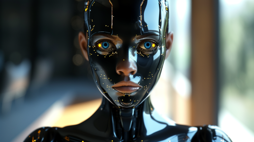 realistic female robot facing forward, matte black translucent skin, robotics glow under skin, photorealistic, cinematic, sharp focus, high resolution, s750, --ar 16:9 --v 6.0