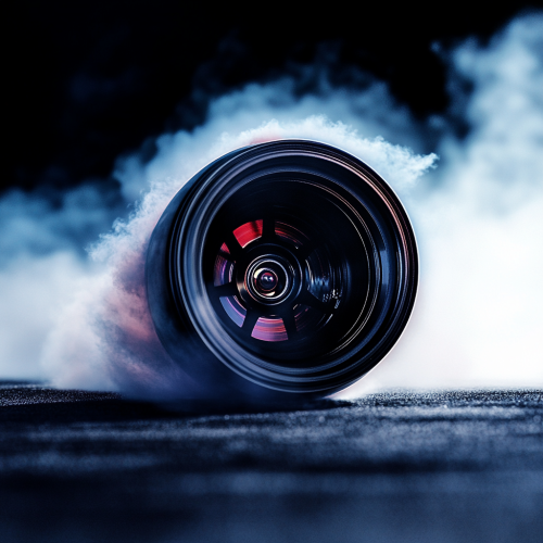 camera lens as a car wheel, video production logo, street car video production, detailed, black background, the camera lens car wheel is on a drift car on a racetrack, tire smoke and wheelspin,