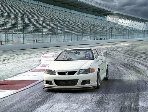 A honda civic fe white color are racing on a race track, camera in front view, movement speed,There are many viewers, The sky is dark and gloomy at night time. look like this formula one cinematic, reslictic and very texture detial, --chaos 40 --ar 4:3 --stylize 500 --weird 300 --v 6.1