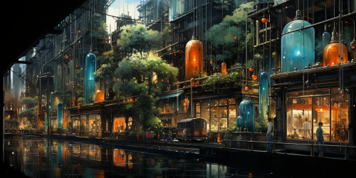 **a future modern city mad out of glass bottles, everything is transparent and beautiful, people are happy and the light is dreamy and silver all buildings are glassy and bottle shape, very realistic, highly detailed, 16k --s 500 --ar 16:8