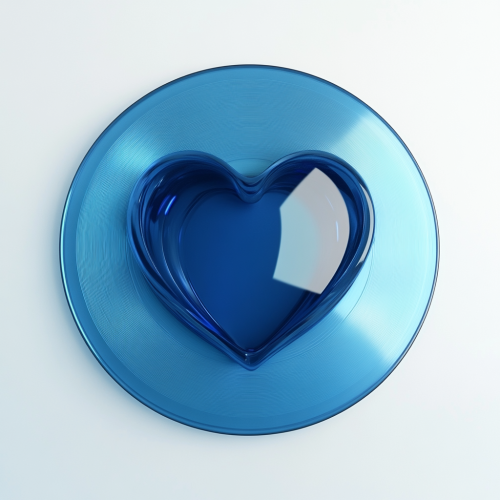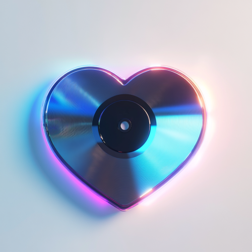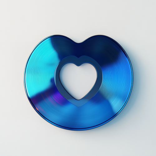 flat shot of a vinal shaped in heart with futuructic techno volume; Location: white background, heart in center of vinal; key colors: blue, flat angel shot; 50mm shot, the shot is flat , no prspective , high quality render; 4k --ar 1:1 --style raw