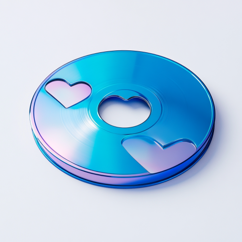 flat shot of a vinal shaped in heart with futuructic techno volume; Location: white background, heart in center of vinal; key colors: blue gradient, flat angel shot; 50mm shot, the shot is flat , no prspective , high quality render; 4k --ar 1:1 --style raw