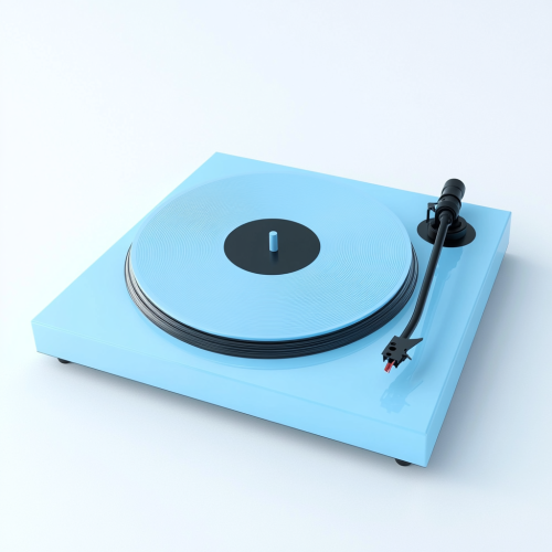 minimalistic flat shot of a vinal with futurictic techno volume; Location: white background, heart in center of vinal; key colors: blue gradient, flat angel shot; 50mm shot, the shot is flat , no pespective , high quality render; 4k --ar 1:1 --style raw