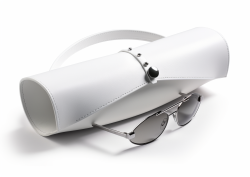 A stunning full-metal glasses case that combines futuristic and classic elements. Elegant and all in white. A detachable strap that can be used as an accessory. Futuristic details. --ar 7:5 --v 5.0