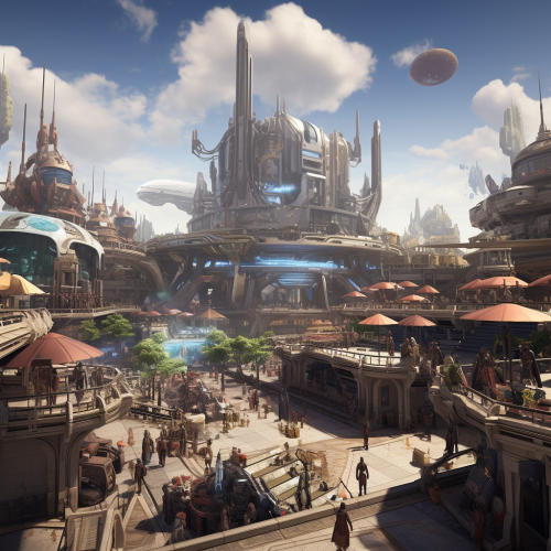 A vibrant market bazaar set in a futuristic city, with vendors selling exotic goods, holographic signs advertising wares, and people dressed in futuristic fashion, 1:1 --v 6.1